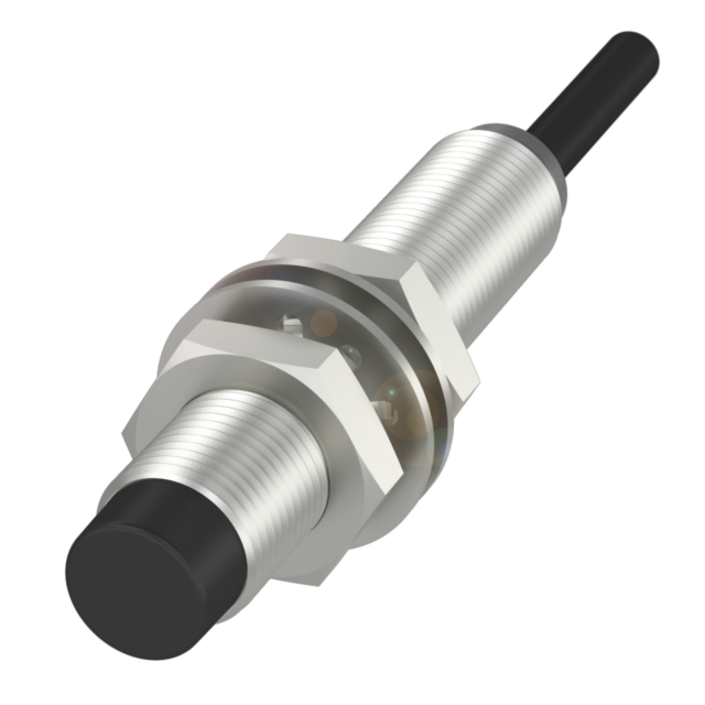 Sensor indutivo M12 com construção reforçada, ideal para automação industrial, oferecendo alta confiabilidade e resistência mecânica.